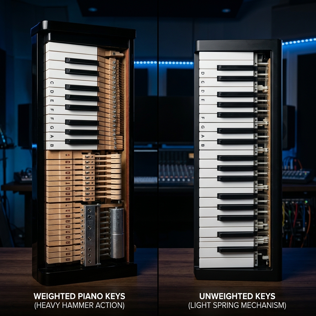 Weighted keys (often found on digital pianos) versus unweighted keys (common on synthesizers).